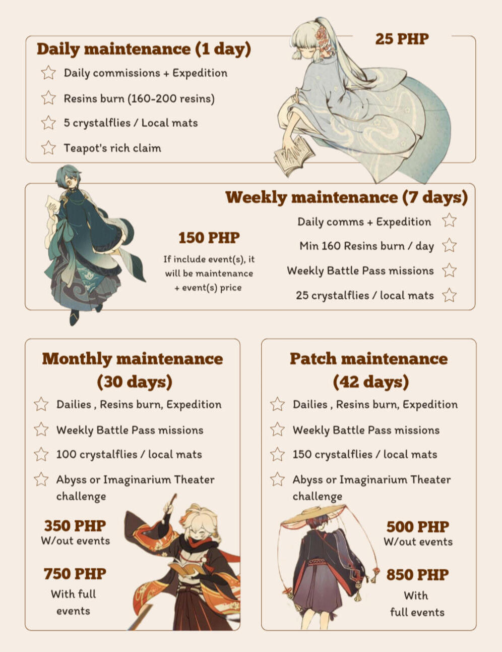 ✦ The packages (montly & patch) include 1 major (no exploration) and all minor IN GAME events. If by the time the service ends that there are still on-going event, we will only do the event till the current event-stages available and is still under the maintenance service.