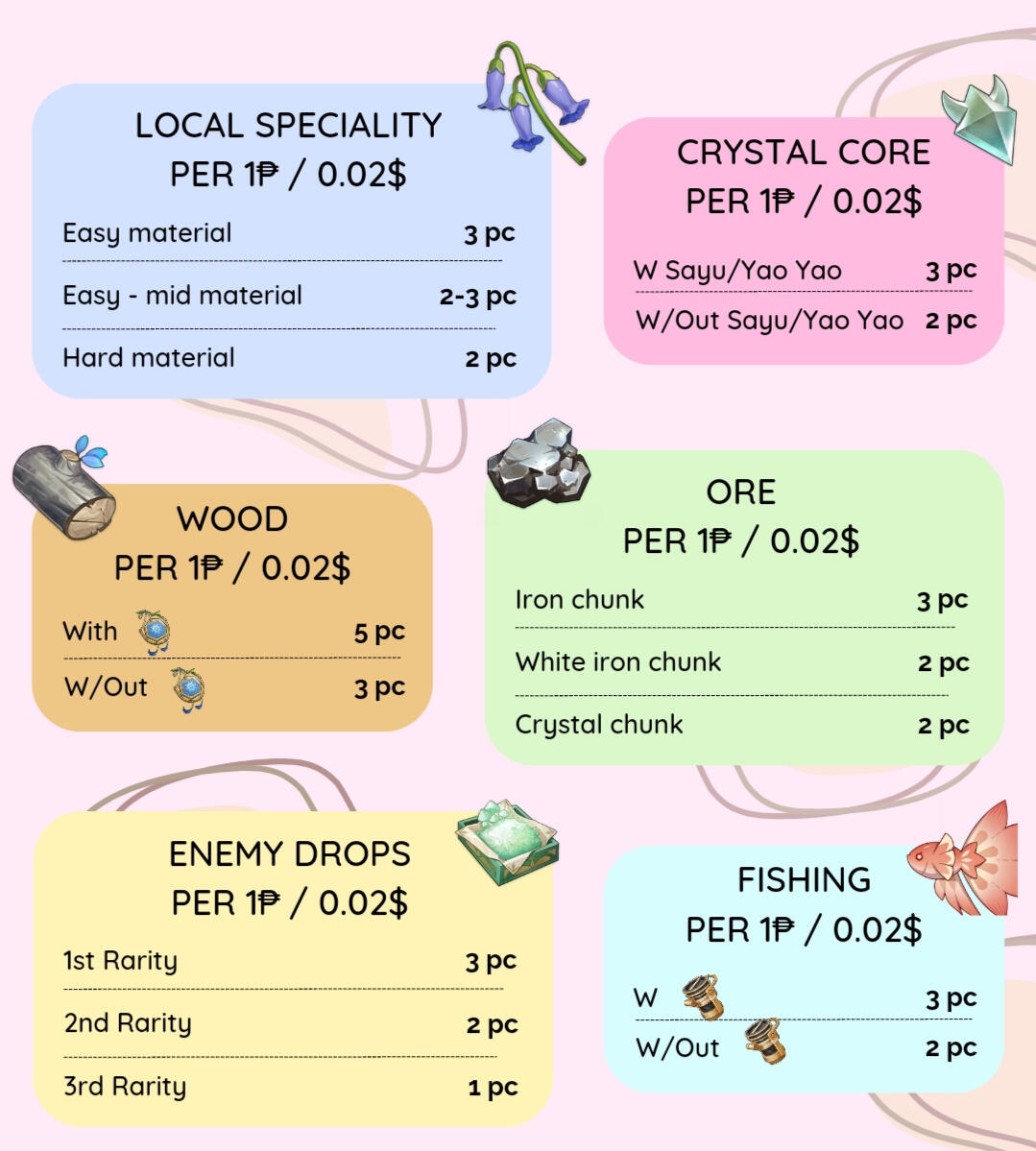 If customer wishes to exchange to other type of materials (resin-related mats, enemy drops, .... ), the provided free mats will be given 1:3 (1st & 2nd rarity mats) or 1:4 (3nd & 4th rarity mats) base on the original amount.